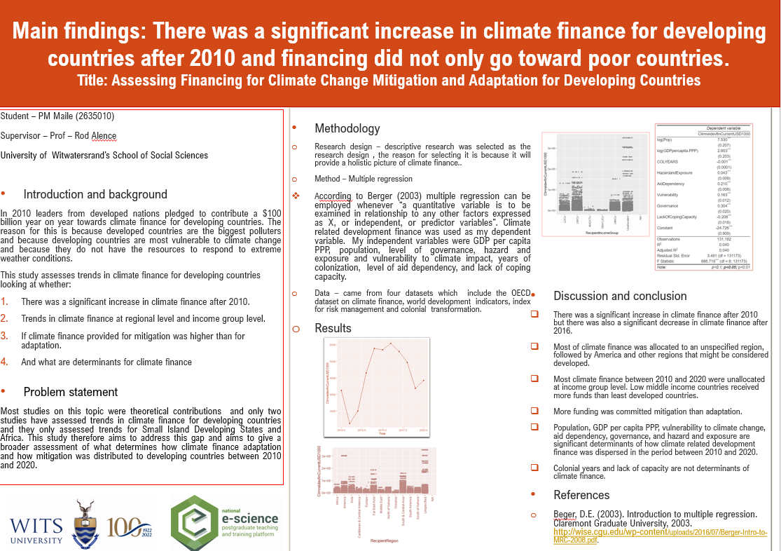 In 2010 leaders from developed nations pledged to contribute a $100 billion year on year towards climate finance for developing countries. The reason for this is because developed countries are the biggest polluters and because developing countries are most vulnerable to climate change and because they do not have the resources to respond to extreme weather conditions.  This study assesses trends in climate finance for developing countries looking at whether: There was a significant increase in climate finance after 2010. Trends in climate finance at regional level and income group level. If climate finance provided for mitigation was higher than for adaptation. And what are determinants for climate finance.