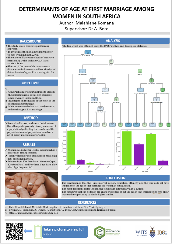 The study uses a recursive partitioning approach. To investigate the age at first marriage for women living in South Africa. There are well known methods of recursive partitioning which includes CART and random forest. The aim of the research is to construct a discrete survival tree for the identification of determinants of age at first marriage for SA women.