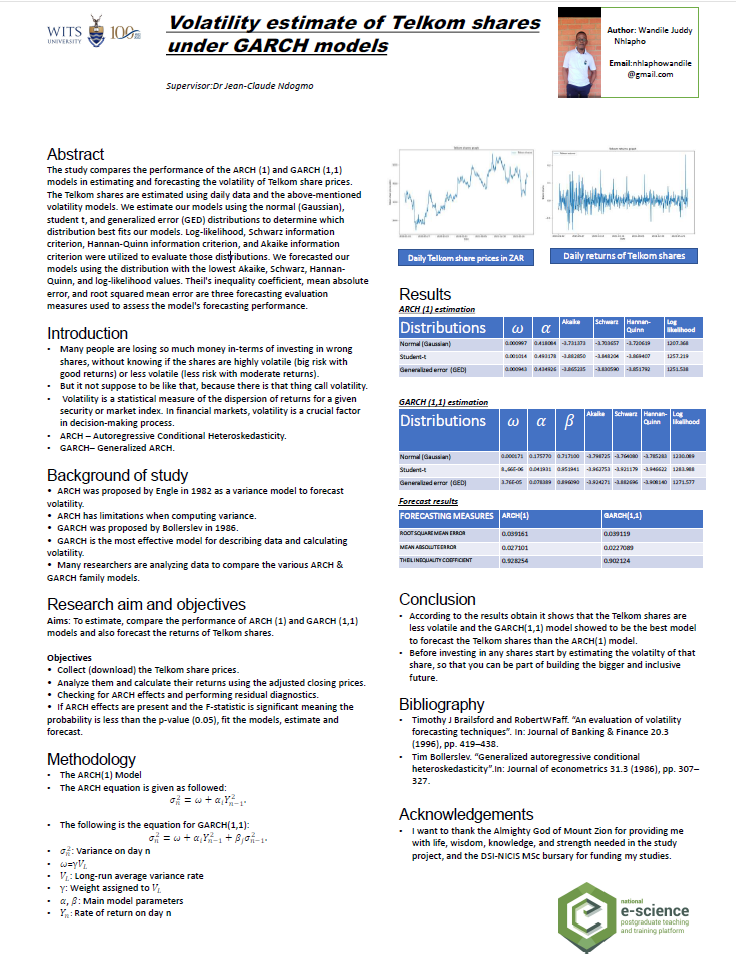 The study compares the performance of the ARCH (1) and GARCH (1,1) models in estimating and forecasting the volatility of Telkom share prices. The Telkom shares are estimated using daily data and the above-mentioned volatility models. We estimate our models using the normal (Gaussian), student t, and generalized error (GED) distributions to determine which distribution best fits our models. Log-likelihood, Schwarz information criterion, Hannan-Quinn information criterion, and Akaike information criterion were utilized to evaluate those distributions. We forecasted our models using the distribution with the lowest Akaike, Schwarz, Hannan-Quinn, and log-likelihood values. Theil’s inequality coefficient, mean absolute error, and root squared mean error are three forecasting evaluation measures used to assess the model’s forecasting performance.